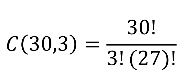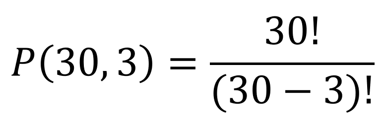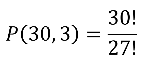Simplifying the expression to 30*29*28 = 24,360 ways 3 individuals can be awarded first, second, and third prize from a group of 30 in a random drawing. If we were merely drawing 3 names all at once with no difference in prizes, it would NOT be considered a permutation.