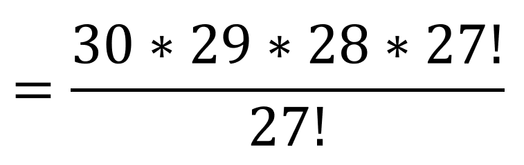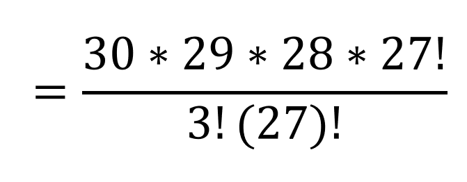 Once the 27! in the numerator and denominator cancel, we are left with the 24,360 in the numerator, but still divide by 3! (which is 3*2 = 6):