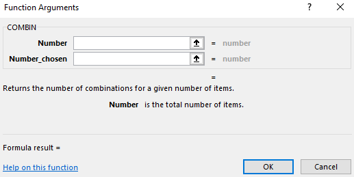 The Excel function for combinations is COMBIN: