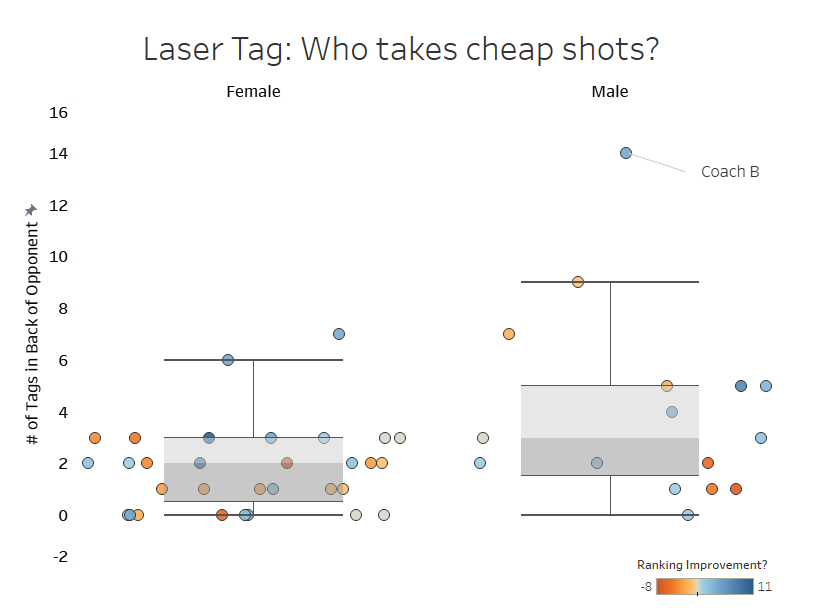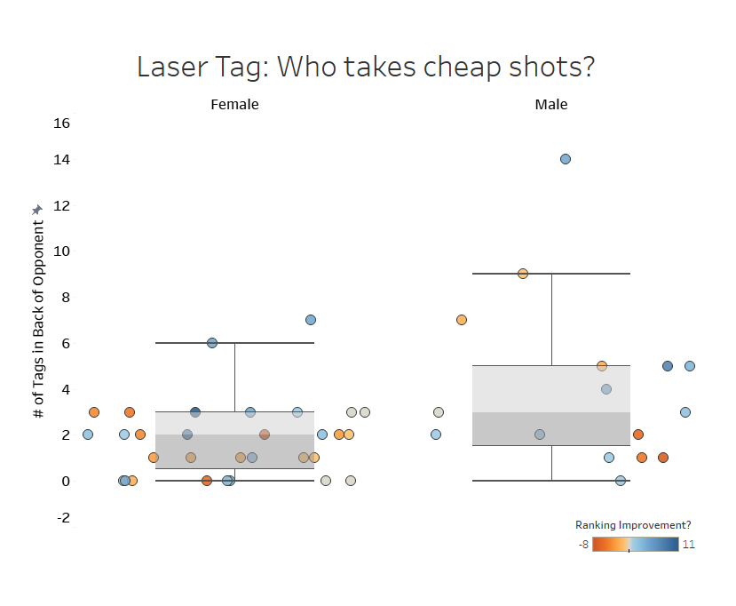 Without calling attention to it, I began this step above. As you can see, I changed up the colors in my charts when I brought in the variable of gender. I did this for you, my audience, so you could easily pick out the differences in the race times for males and females. This is called “leveraging pre-attentive attributes“, which basically means here I’ve used color to help you see the differences without consciously thinking about it. In my final version I will need to make sure the difference in gender is clear and easy to compare (more on this later).