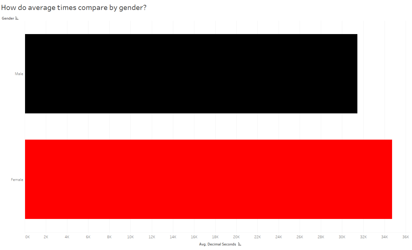 And as you continue to ask questions, you’ll pull out more interesting insights. Since the distribution of gold medals looks similar to the distribution of all medals, I’m still quite curious why the average times for the US is higher than other countries when they have an overwhelmingly large number of gold medals (and gold medals = fastest times). There MUST be some other variable confounding this comparison. So now I’ll slice the data by other variables — now I’ll look at gender, and compare the overall average finish times of males vs females: