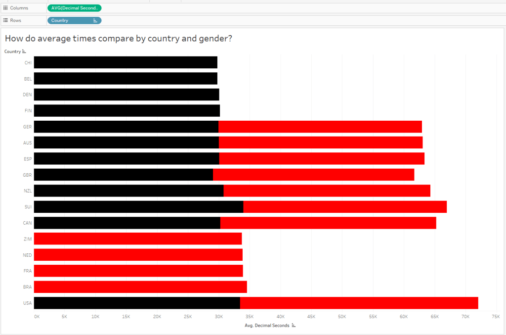 Hmmm, it looks like the top countries, by average time, are represented by male athletes only. Meanwhile, females, whose times are slightly slower than males, make up a large proportion of the remaining countries.