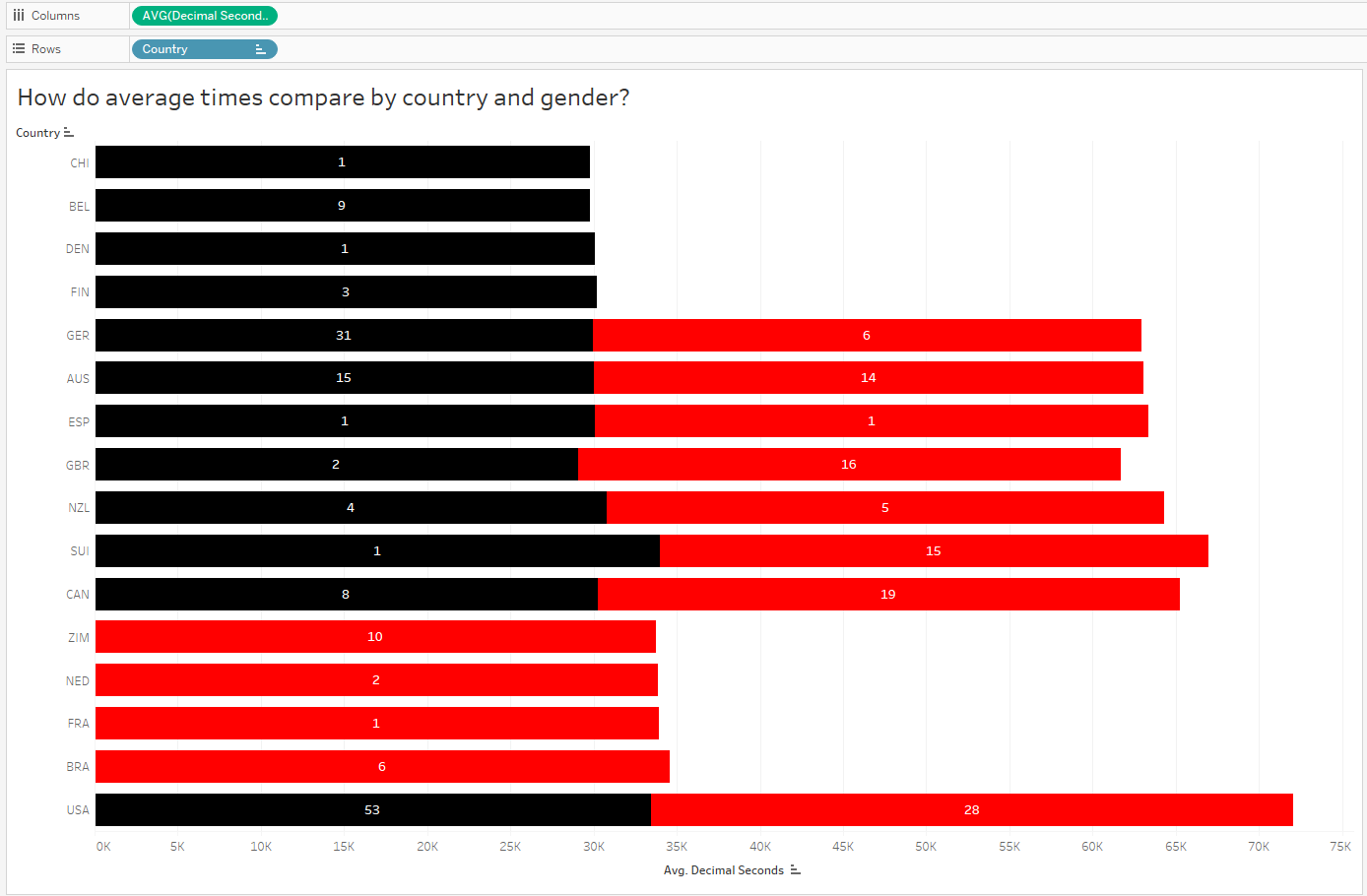 Since the above chart is comparing average race times, let’s bring in some counts to compare the number (and ultimately proportion) of male vs female athletes in each country.