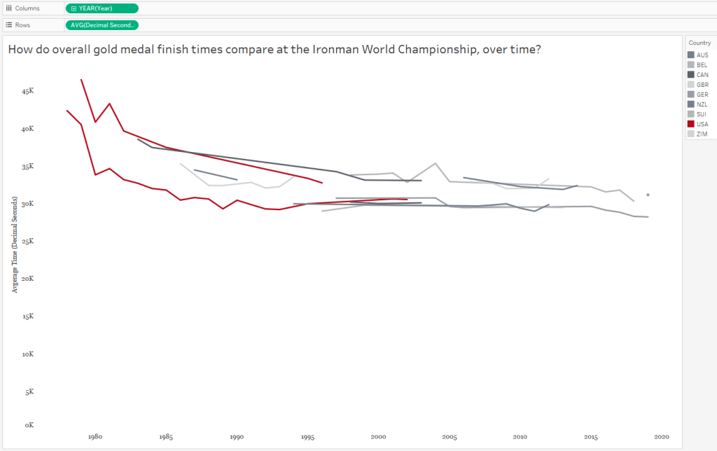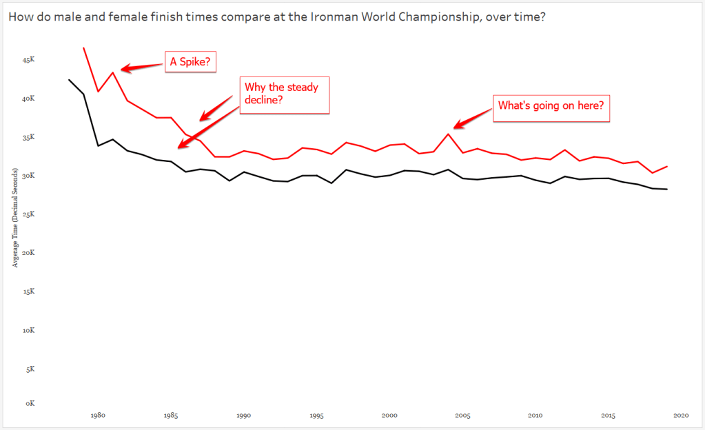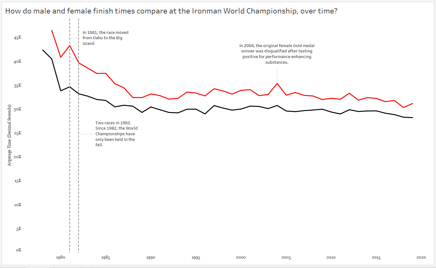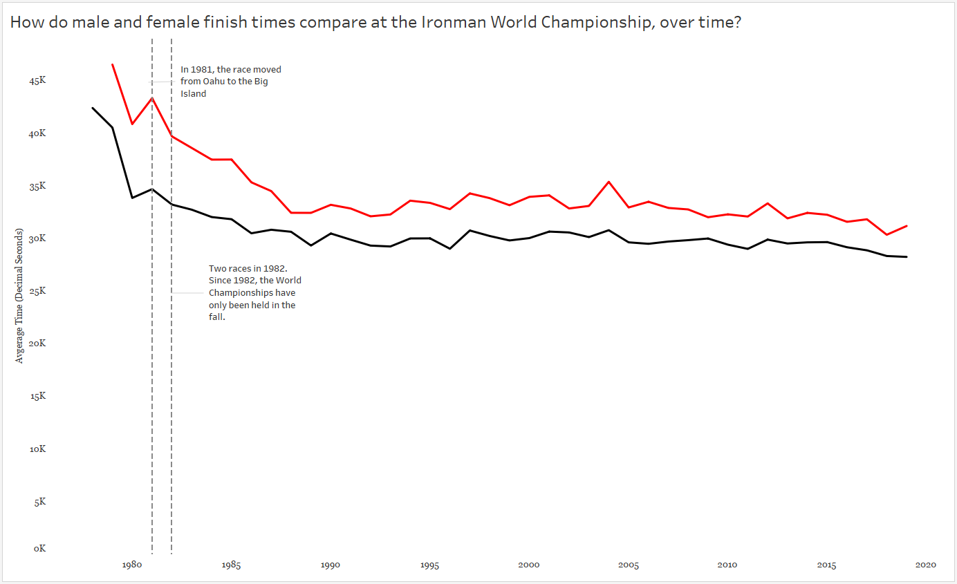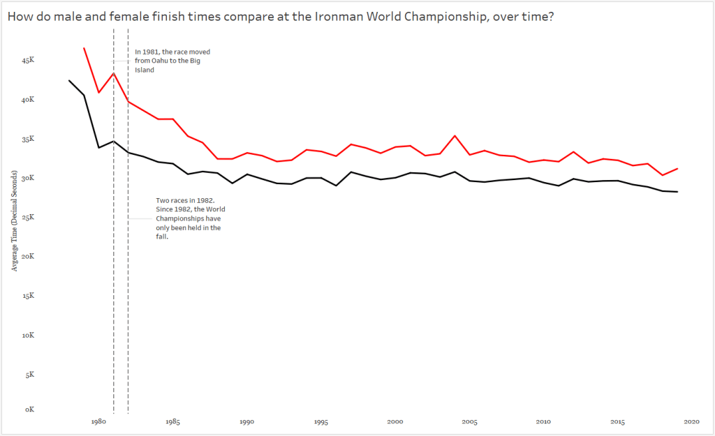 And clearly there is more to investigate here – like why, if I stick with Tableau’s default aggregation of SUM do I see a spike here? After some Googling – ah, that year TWO separate Ironman Championships were held. So even though I’m looking only at times for the male and female gold medal times, there’s one year that’s doubled because there are two gold medal times per gender. Easy fix, let’s change the aggregation to AVERAGE, which will only affect this one year. Now let’s tease out our big story by looking at our chart and asking more questions :