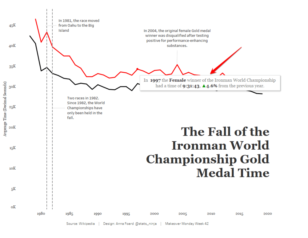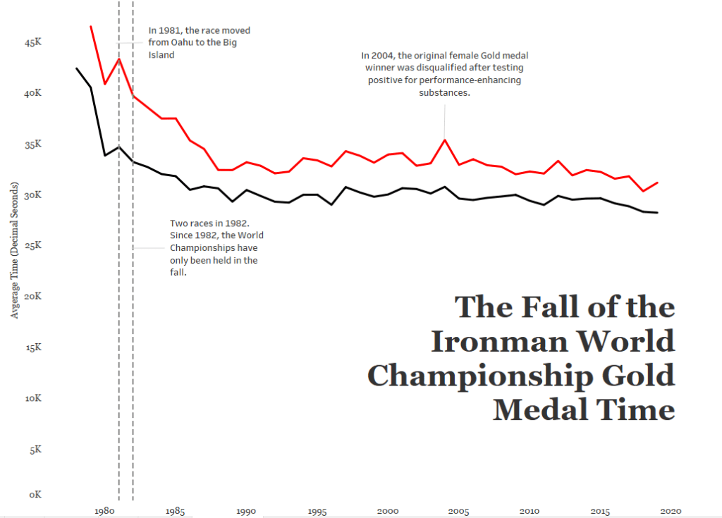 A subtitle can help guide the audience to a specific insight, in this case the overall decline in gold medal times by both males and females since the first Ironman World Championship in 1978.