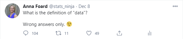 You can Google the definition of data and find a slew of different answers, but one simplistic way to think about data is how my favorite Statistics textbook defines the term: “Data are usually numbers, but they are not ‘just numbers.’ Data are numbers with context.” (Yates, et al. The Practice of Statistics 3rd Edition.) So when we pull quantitative variables and qualitative (categorical) variables together, we are essentially giving meaning to what was otherwise a set of lonely numerical values.