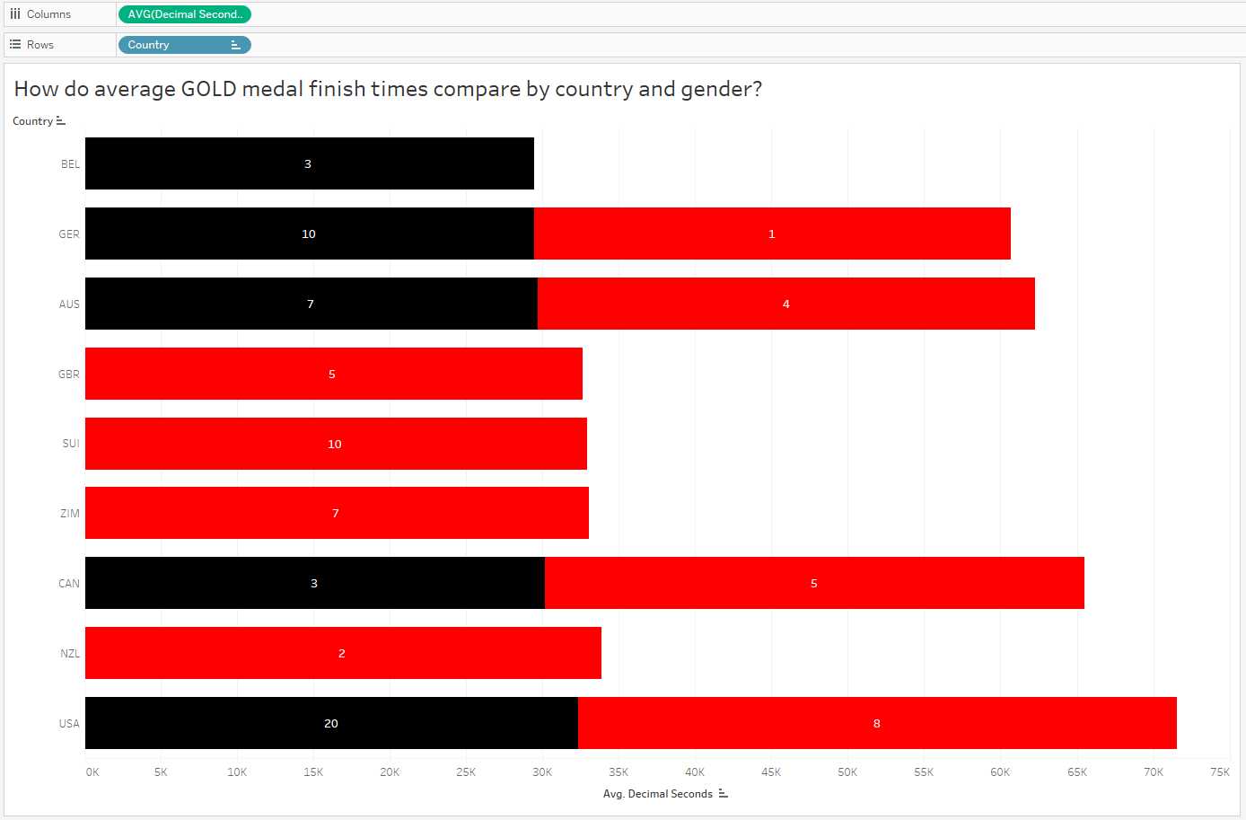Wow, interesting! Of the 9 countries with gold medals, 8 of them have female representation on the 1st place podium. And 4 of those 9 countries ONLY have female representation at gold. But this doesn’t explain why the US has taken home so many more gold medals than other countries, while the overall average finish times for US finishers (and gold medalists too) are slower! What’s going on?
