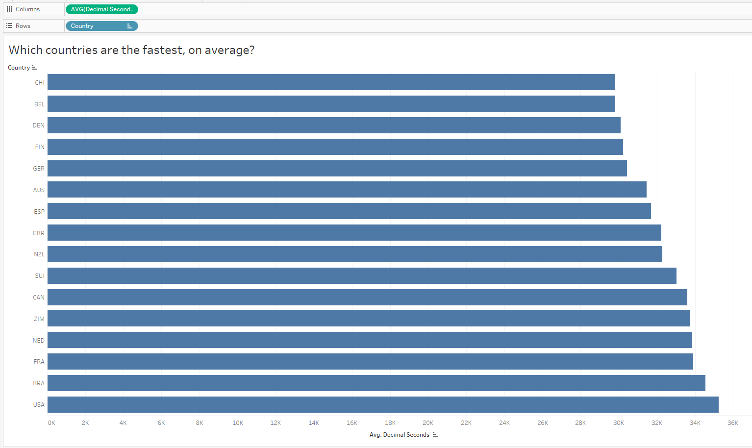 We can also ask, “Which countries are the fastest, on average?” I’ve sorted low to high to reflect the fastest countries on top (faster = shorter duration):