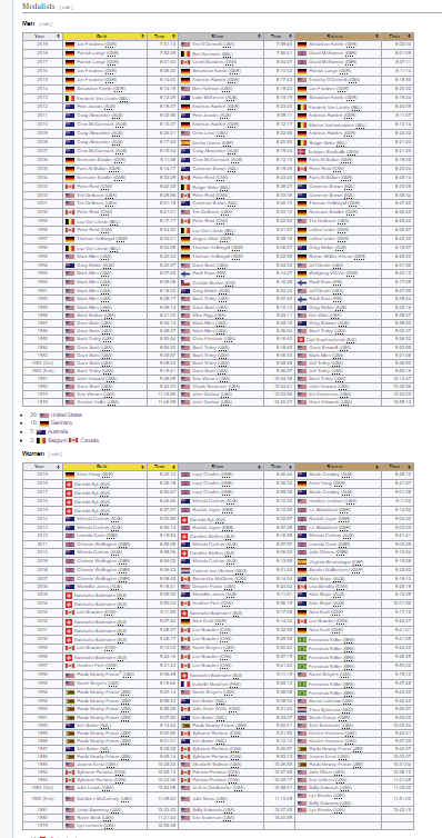 And finally, I called attention to the spike in 2004. Apparently the gold medal finisher was DQ’ed for doping…which makes me wonder about the sharp decline in the 1980’s.
