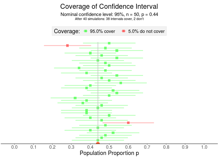 What if John Cena actually has 44% of the vote? Here, I’ve visualized 40 samples for which 38 contain that 44% Notice the confidence interval has two parts – the square in the middle represents the sample proportion and the horizontal line is the margin of error.
