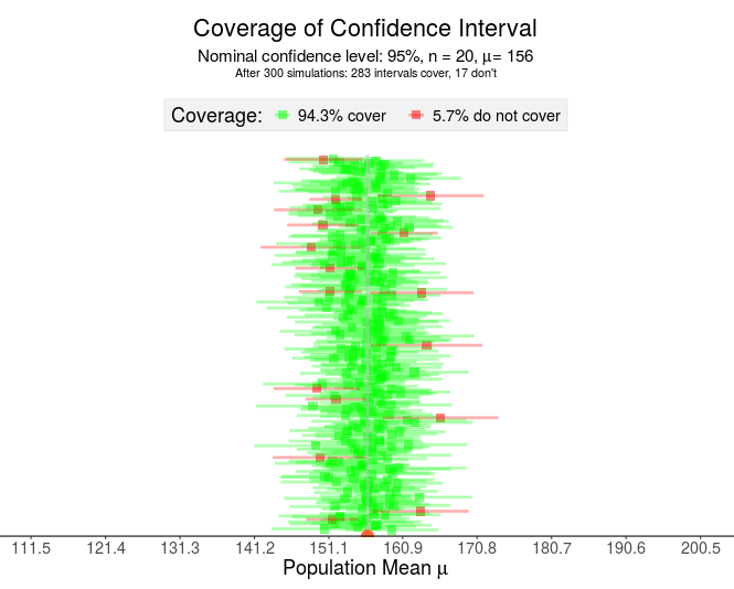 Beneath the population distribution are the simulation results of 300 samples of n = 20 pandas (sampled using an identical sampling method each time). Notice that roughly 95% of the intervals cover the true mean — capturing 156.2 within the interval (the green intervals) while close to 5% of intervals do NOT capture the 156.2 (the red intervals).