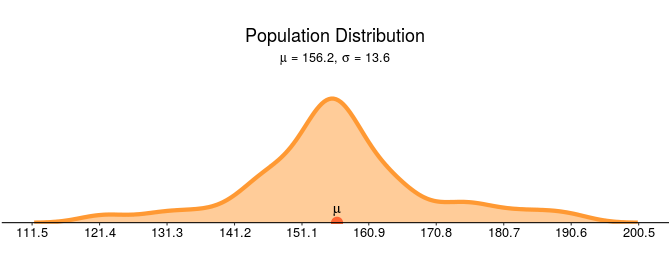 Let’s assume the density curve below represents the actual population mean weights of all adult female pandas. In this made up example the mean weight of all adult pandas is 156.2 pounds with a population standard deviation of 13.6 pounds.